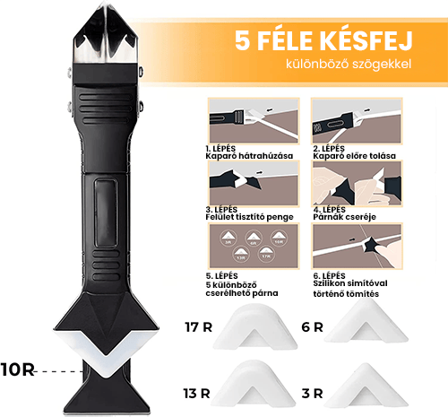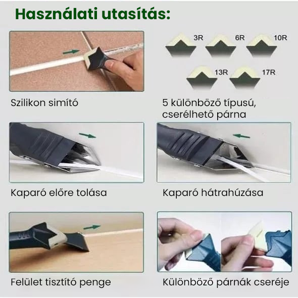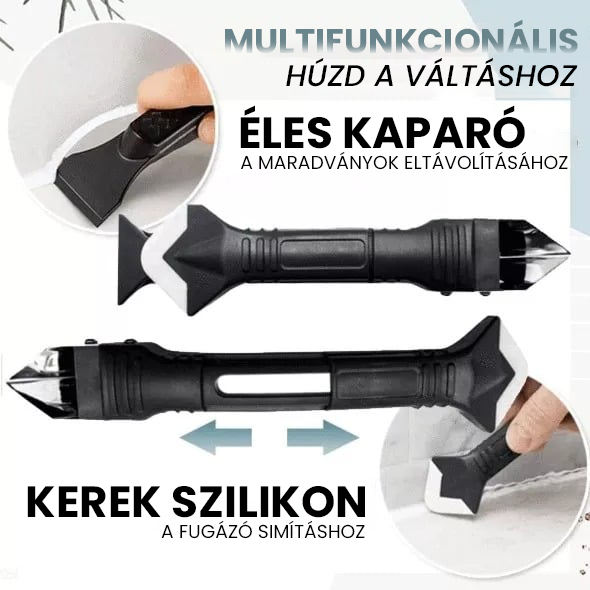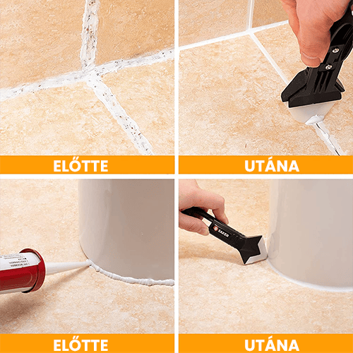 Το έξυπνα σχεδιασμένο σετ εργαλείων αρμολόγησης συνδυάζει τρία πρακτικά εργαλεία σε ένα: μπορεί να χρησιμοποιηθεί ως σπάτουλα σιλικόνης, ξύστρα υπολειμμάτων ή κοφτερή λεπίδα.