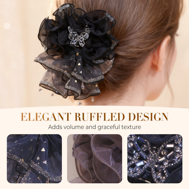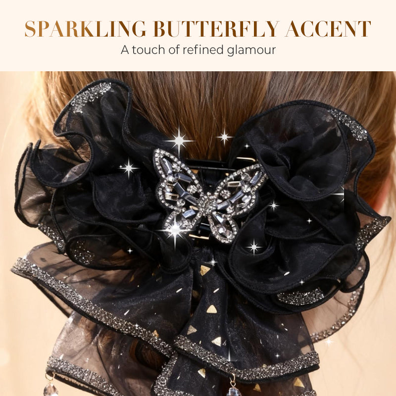ΛΑΜΠΡΕΣ ΚΡΥΣΤΑΛΛΙΝΕΣ ΠΙΝΕΛΙΕΣ - Διακοσμημένο με μια κεντρική πεταλούδα και κρεμαστά μενταγιόν, τα λαμπερά κρύσταλλα αντανακλούν όμορφα το φως. Αυτό προσθέτει μια πινελιά γοητείας και πολυτέλειας, καθιστώντας το ιδανικό για ειδικές περιστάσεις και βραδινές εμφανίσεις.